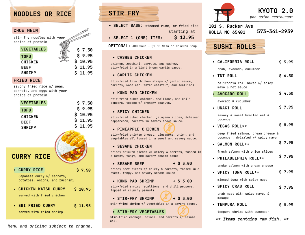 Welcome to Kyoto 2.0 Pan Asian Restaurant, a delightful culinary haven located at 101 S Rucker Ave in Rolla, MO. Here, the menu showcases a vibrant array of Pan Asian flavors designed to tantalize your taste buds. Dive into an assortment of sushi rolls, including the luscious Unagi Roll and the refreshing Philadelphia Roll, or savor the comforting warmth of Chow Mein and Fried Rice, both priced at a reasonable $7.50.